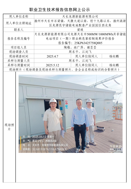 天長龍源新能源有限公司龍源天長市500MW/1000MWh共享儲能電站項目(一期)職業病危害控制效果評價報告 報告編號:25KP63425758Q005