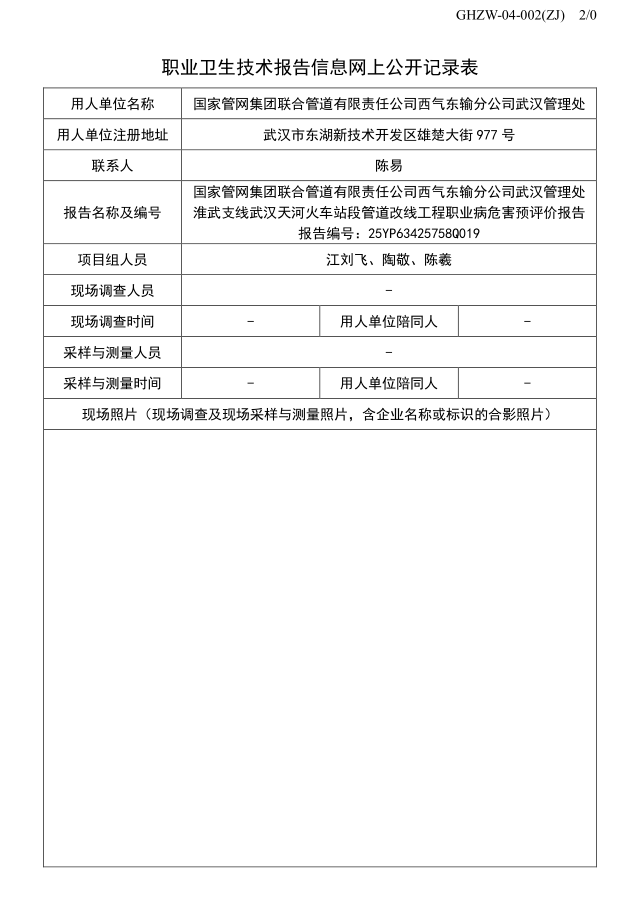國(guó)家管網(wǎng)集團(tuán)聯(lián)合管道有限責(zé)任公司西氣東輸分公司武漢管理處淮武支線武漢天河火車站段管道改線工程職業(yè)病危害預(yù)評(píng)價(jià)報(bào)告 報(bào)告編號(hào):25YP63425758Q019