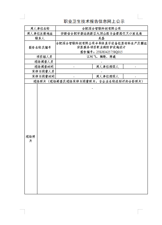 合肥深合智聯(lián)科技有限公司半導(dǎo)體顯示設(shè)備包裝材料生產(chǎn)及搬運安裝服務(wù)項目職業(yè)病防護設(shè)施設(shè)計 報告編號:25SJ63425758Q015