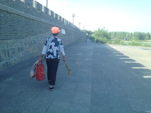 (圖為環衛工人在清掃垃圾,城墻周圍的環衛工人很多,所為城墻周邊的衛生狀況要比城內好上不少。)